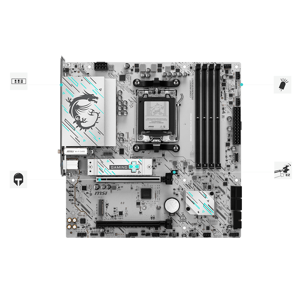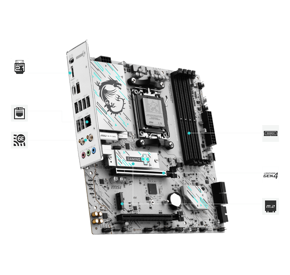 The B840M GAMING PLUS WIFI6E is crafted to offer extensive connectivity, versatile tools, and Wi-Fi solution for gamers seeking a comprehensive experience. Featuring Wi-Fi 6E, 2.5G LAN, PCIe 4.0 solution and exclusive EZ DIY features, it is ready for 24/7 non-stop gaming optimized for AMD Ryzen™ 9000 series processors.