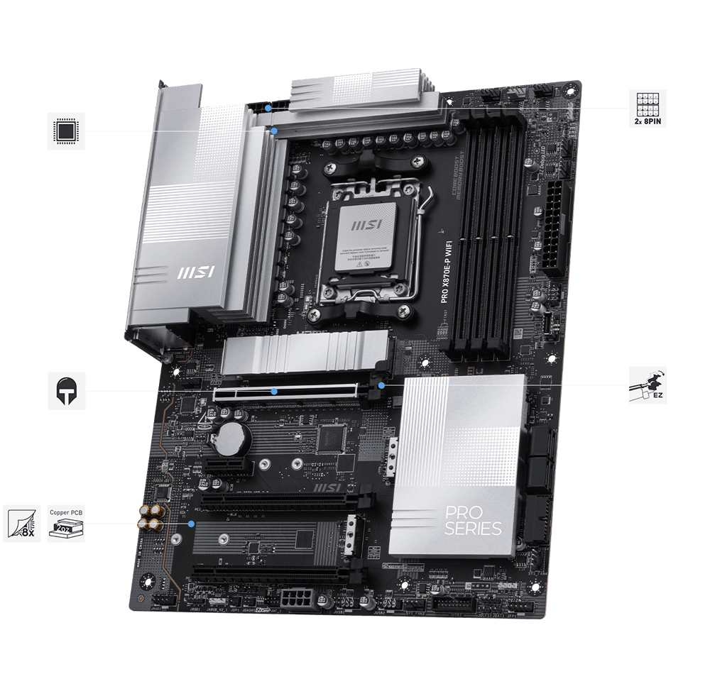 PRO X870E-P WIFI offers a simple design with a harmonious silver color scheme that perfectly matches both white and black PC builds. It is engineered with many exclusive features of MSI, a true Wi-Fi 7 with EZ Antenna, 5G LAN, PCIe 5.0 M.2 with EZ M.2 Shield Frozr II, and Supplemental PCIe Power, ready for the AMD Ryzen™ 9000 series processors.